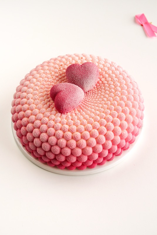 Démouler l’entremets congelé et le floquer directement le bas avec le spray velours fushia, puis un peu plus haut le rosé et le blanc sur le dessus afin de donner une impression de dégradé. (Il est préférable de floquer à l’intérieur d’un lave-vaisselle ou d’un gros carton, pour limiter le nettoyage après.) Laisser décongeler au moins 4 heures au réfrigérateur avant de déguster.