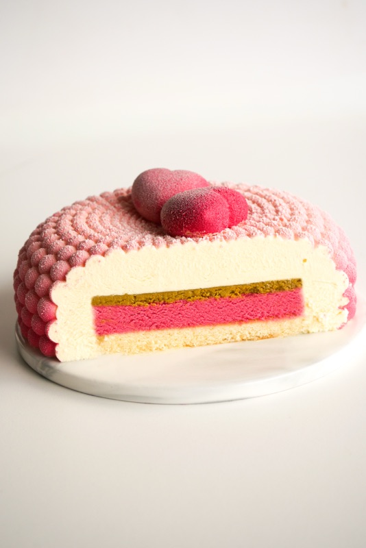 Un doux entremets aux goûts de fraises, pistache et chocolat blanc, vu et revu mais un incontournable.