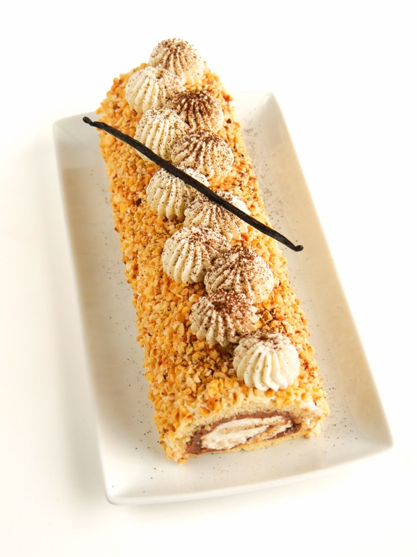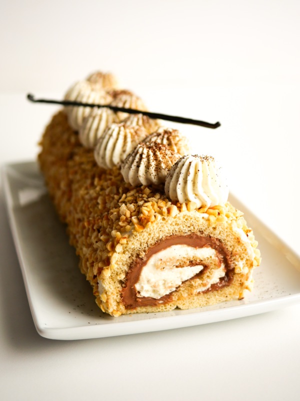 Cette bûche roulée est une invitation à la gourmandise tout en douceur. Son biscuit viennois délicatement vanillé enveloppe une crème de noisettes, sublimée par une ganache vanille riche et fondante. Les noisettes concassées apportent une touche de croquant qui équilibre parfaitement l’ensemble. Une bûche roulée raffinée, idéale pour les amateurs de saveurs réconfortantes et élégantes.