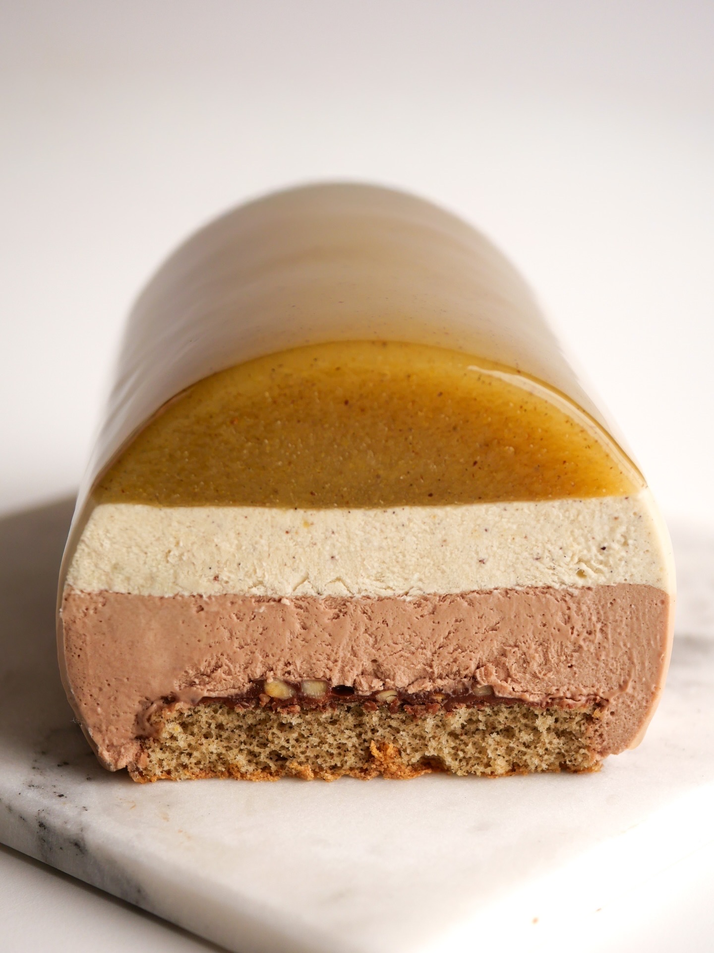 Une bûche tout en douceur, composée d’une compotée de poire fondante, d’une mousse vanille onctueuse et d’une mousse au chocolat au lait. Elle repose sur une génoise vanille moelleuse et un croustillant au chocolat au lait, le tout sublimé par un glaçage neutre ultra brillant.